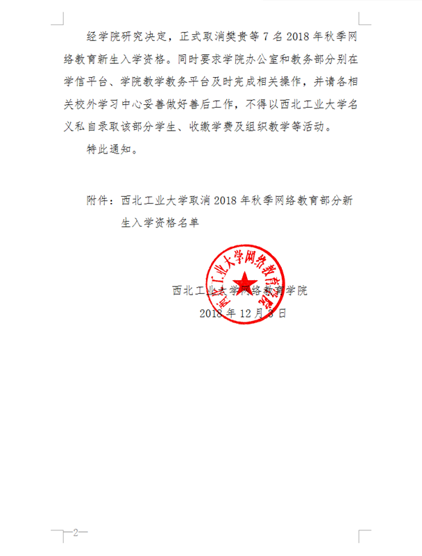 关于取消2018年秋季网络教育部分新生入学资格的通知