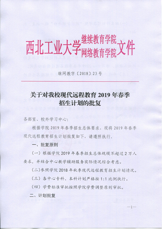 关于对公司现代远程教育2019年春季招生计划的批复