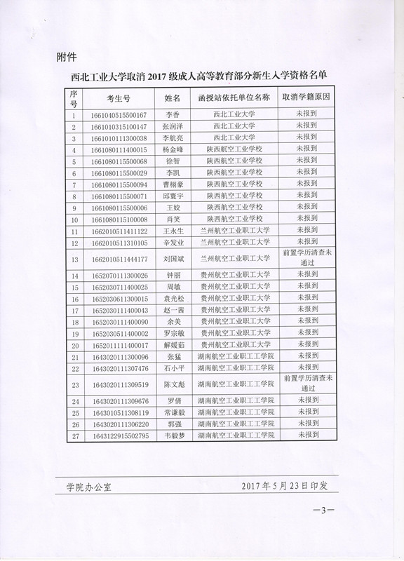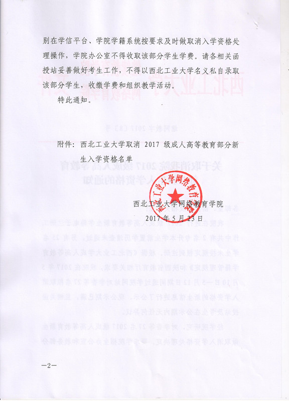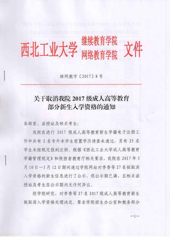 关于取消公司2017级成人高等教育部分新生入学资格的通知