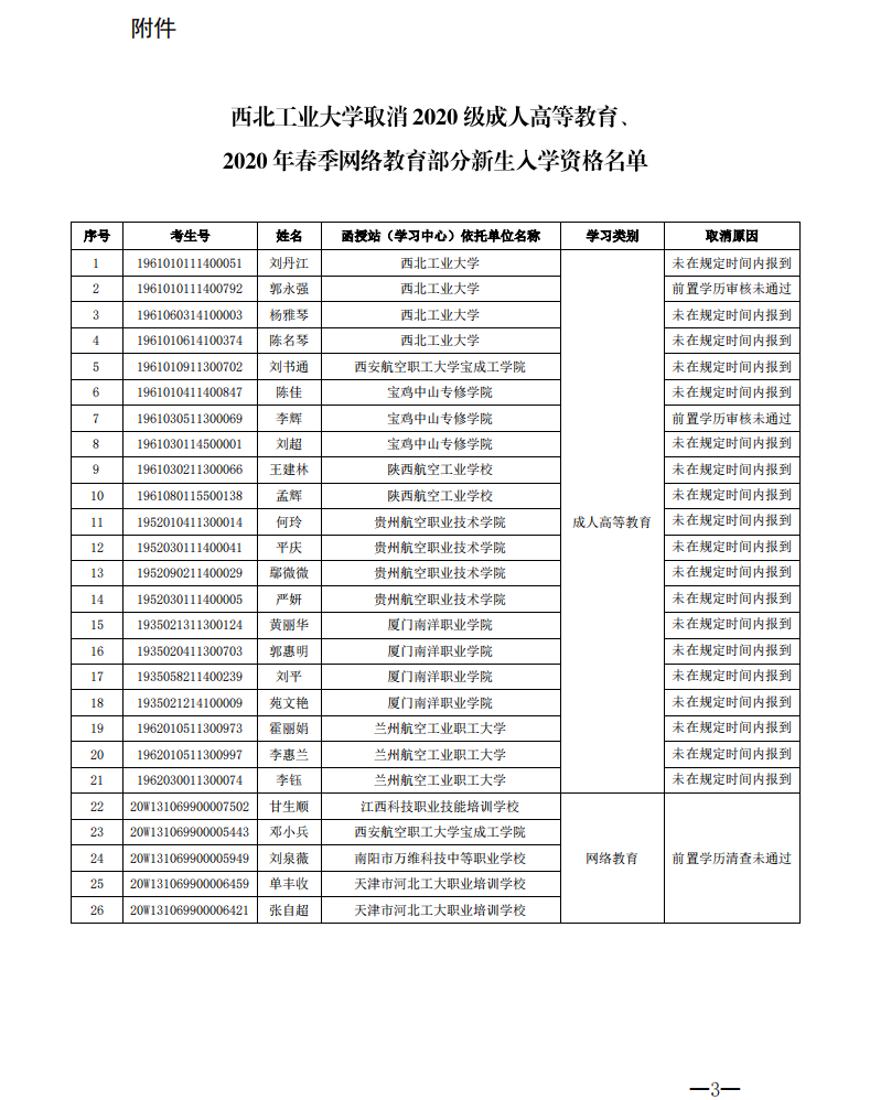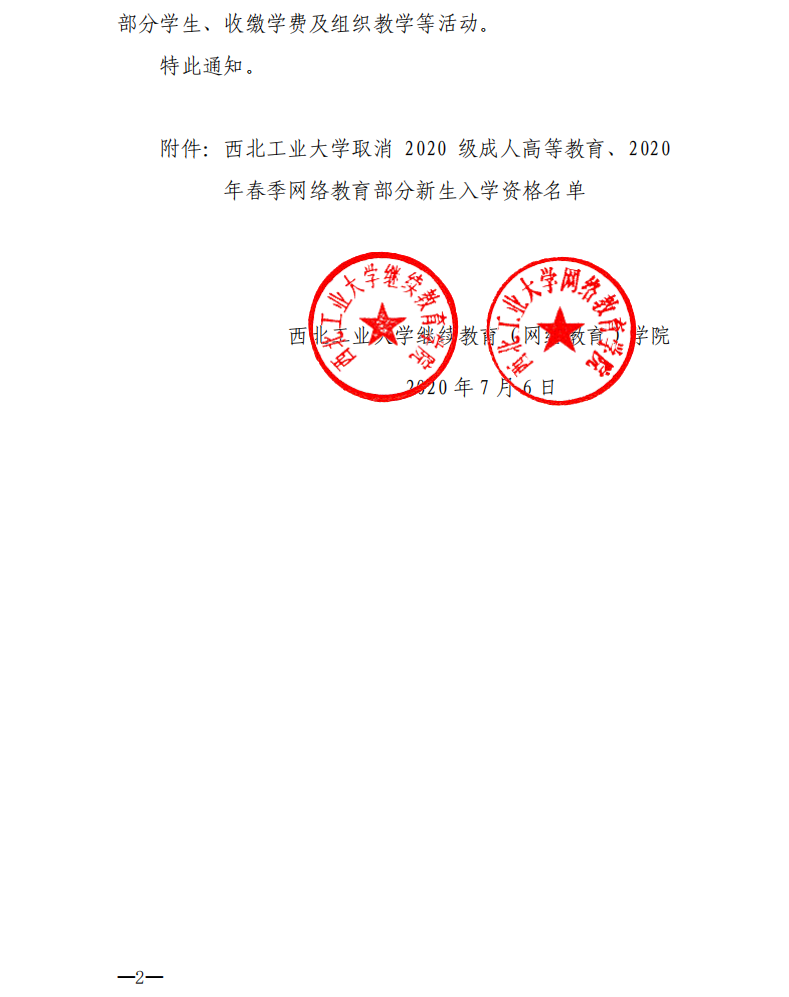 关于取消2020级成人高等教育、2020年春季网络教育部分新生入学资格的通知