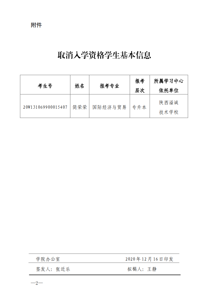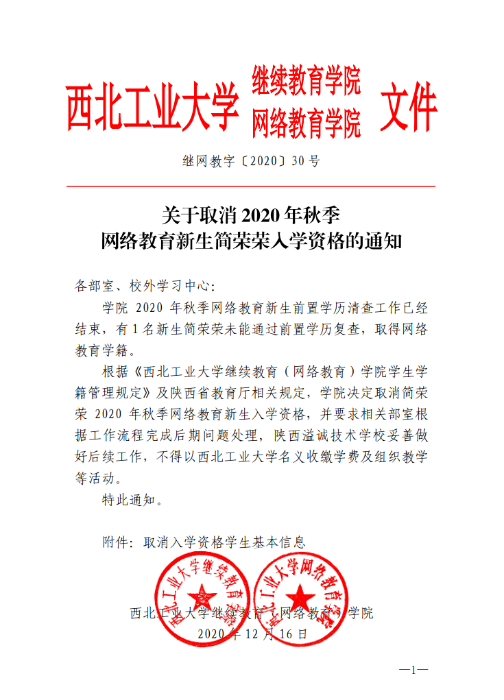 关于取消2020年秋季网络教育新生简荣荣入学资格的通知