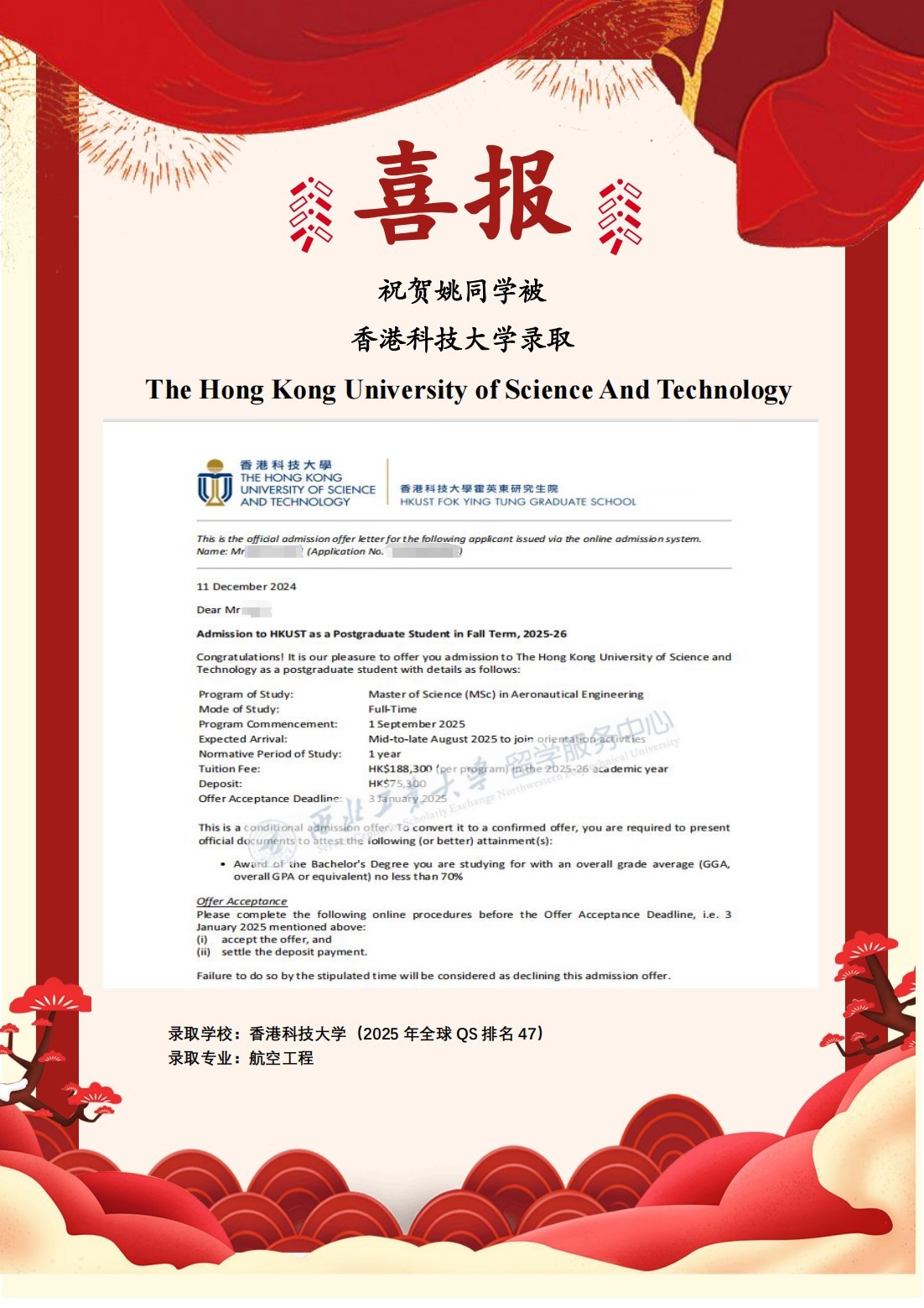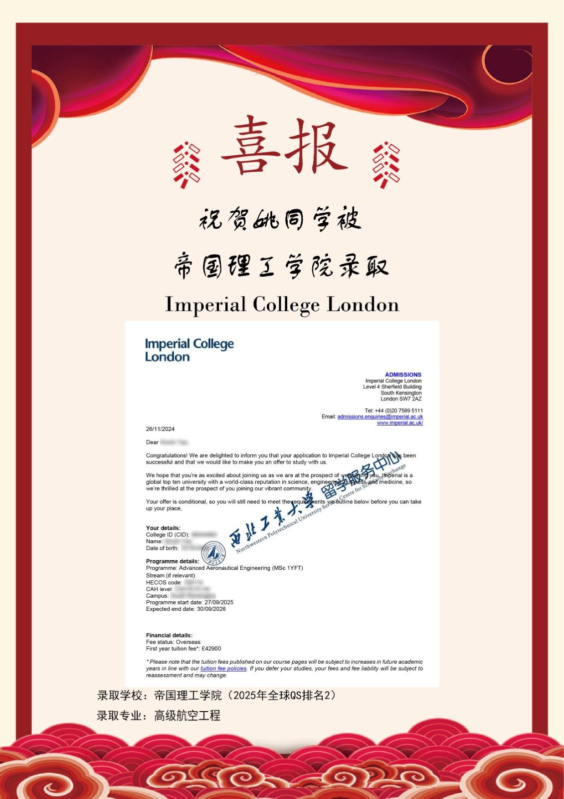 祝贺公司姚同学成功获得三所2025QS排名前50的名校录取通知书,这不仅是对她努力和才华的认可,也是我中心及公司国际化教育成果的体现。愿姚同学在新的学习生活环境中不断进步,为未来的职业生涯打下坚实的基础,创造更辉煌的成就!