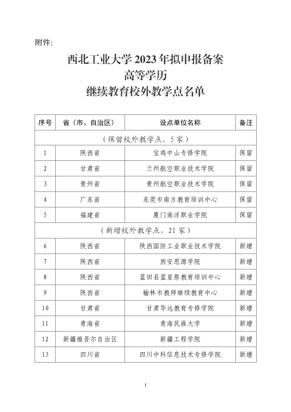 根据《教育部办公厅关于严格规范高等学历继续教育校外教学点设置与管理工作的通知》(教职成厅〔2022〕1号)文件精神,结合各省级教育行政主管部门要求,经公司党委常委会研究同意,拟保留宝鸡中山专修公司等5家校外教学点,新增陕西国防工业职业技术公司等21家校外教学点(名单见附件)。